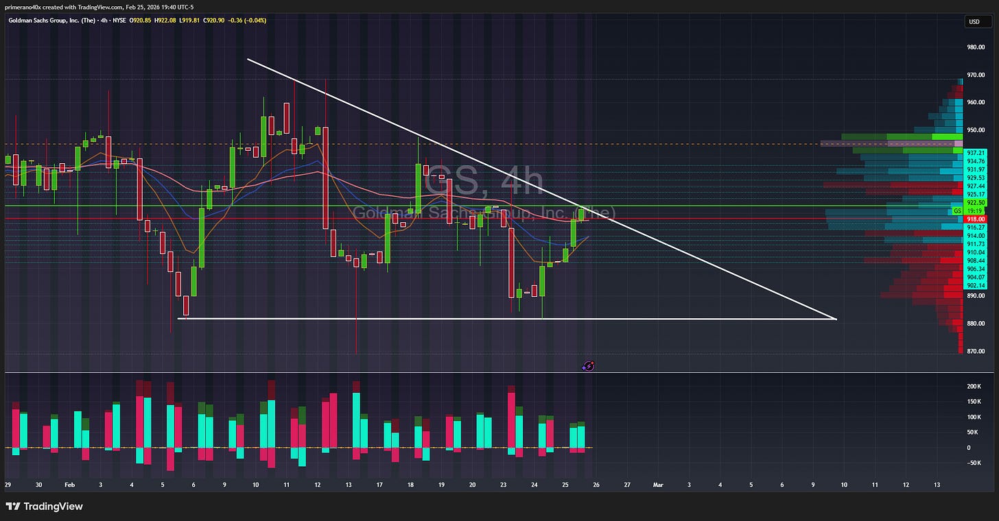 GS 0.00%↑ 4 hour consolidating wedge. I’ve said this before on this name, but you need to take profits when you see them or prepare for some quick moving price action. Closing at the trendline today above the 9/20/50 ema’s, we will watch for a breakout for calls and a rejection for puts.