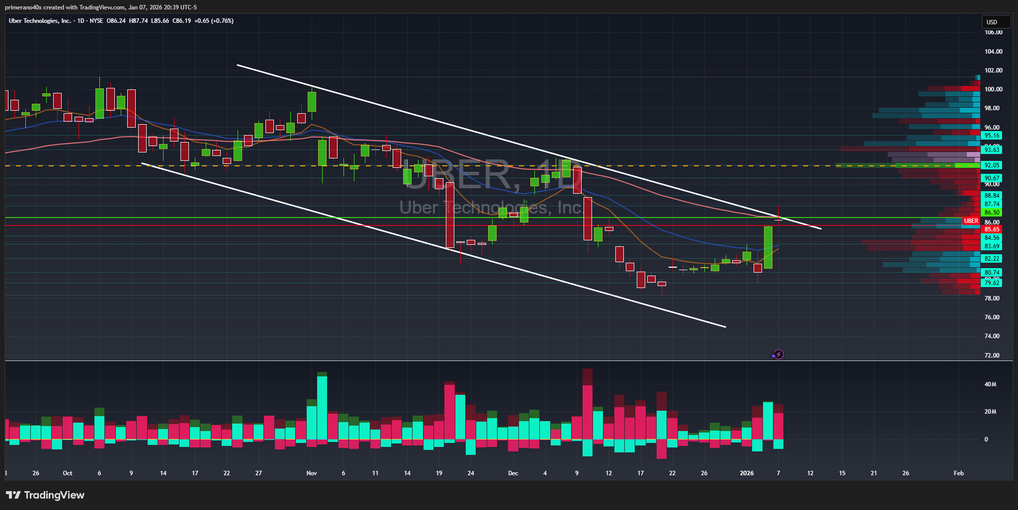 UBER 0.00%↑ daily bull flag could not hold the breakout today and closed just under the trendline an 50ema to end the day. So tomorrow we will watch for buying volume and a retry of the breakout for calls. A rejection of that trendline will have us in puts and we can head back towards the $83 level. Here’s the plan.