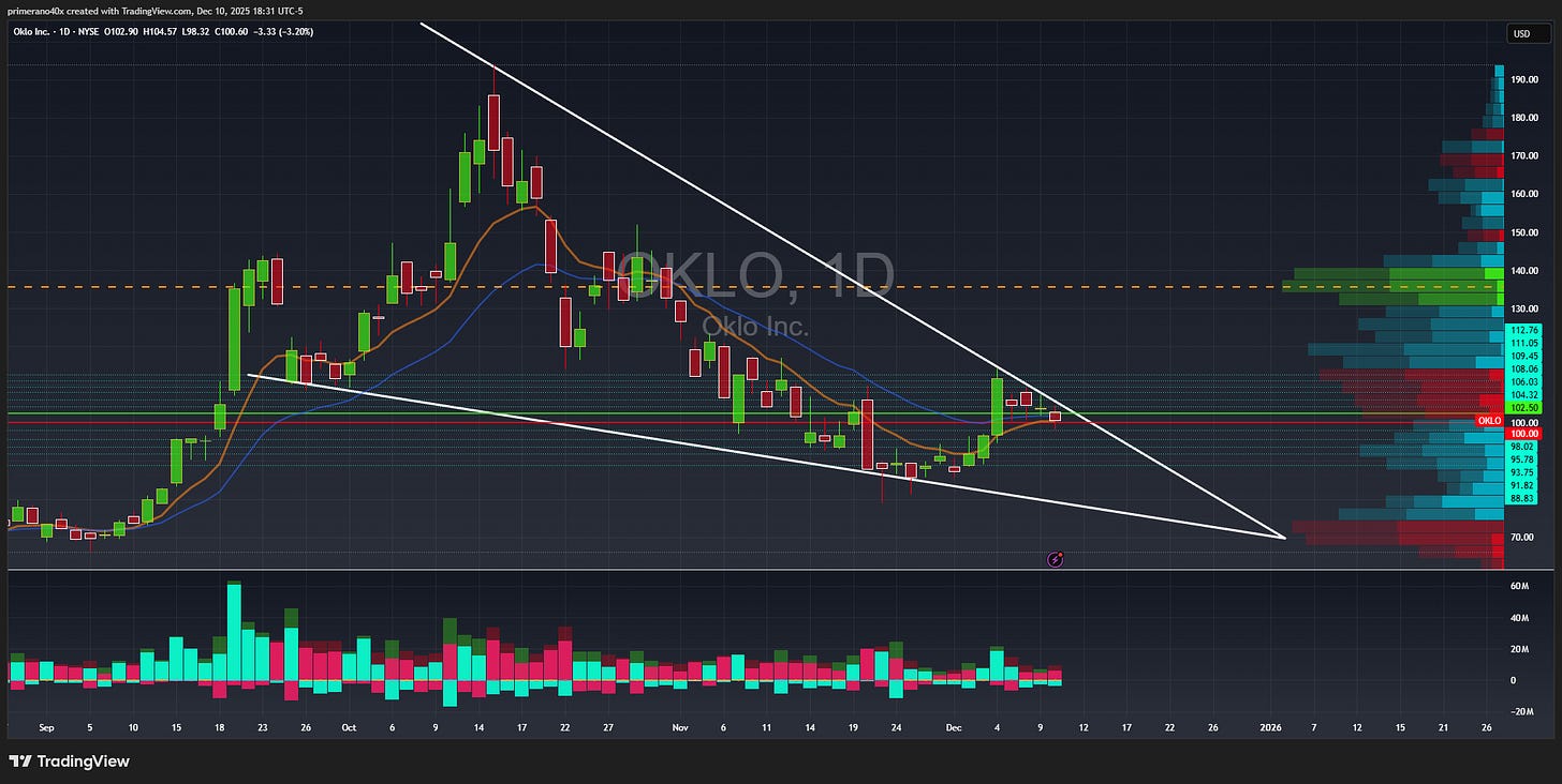 OKLO 0.00%↑ daily falling wedge has been basing, but rejecting, under the trendline so far this week. This is a big mover when it goes, and the fact that we are still holding over the 9 ma shows that support is still present here. If buyers step in and we get a breakout this will fly. If we reject and flush we are in puts. Here’s the setup.