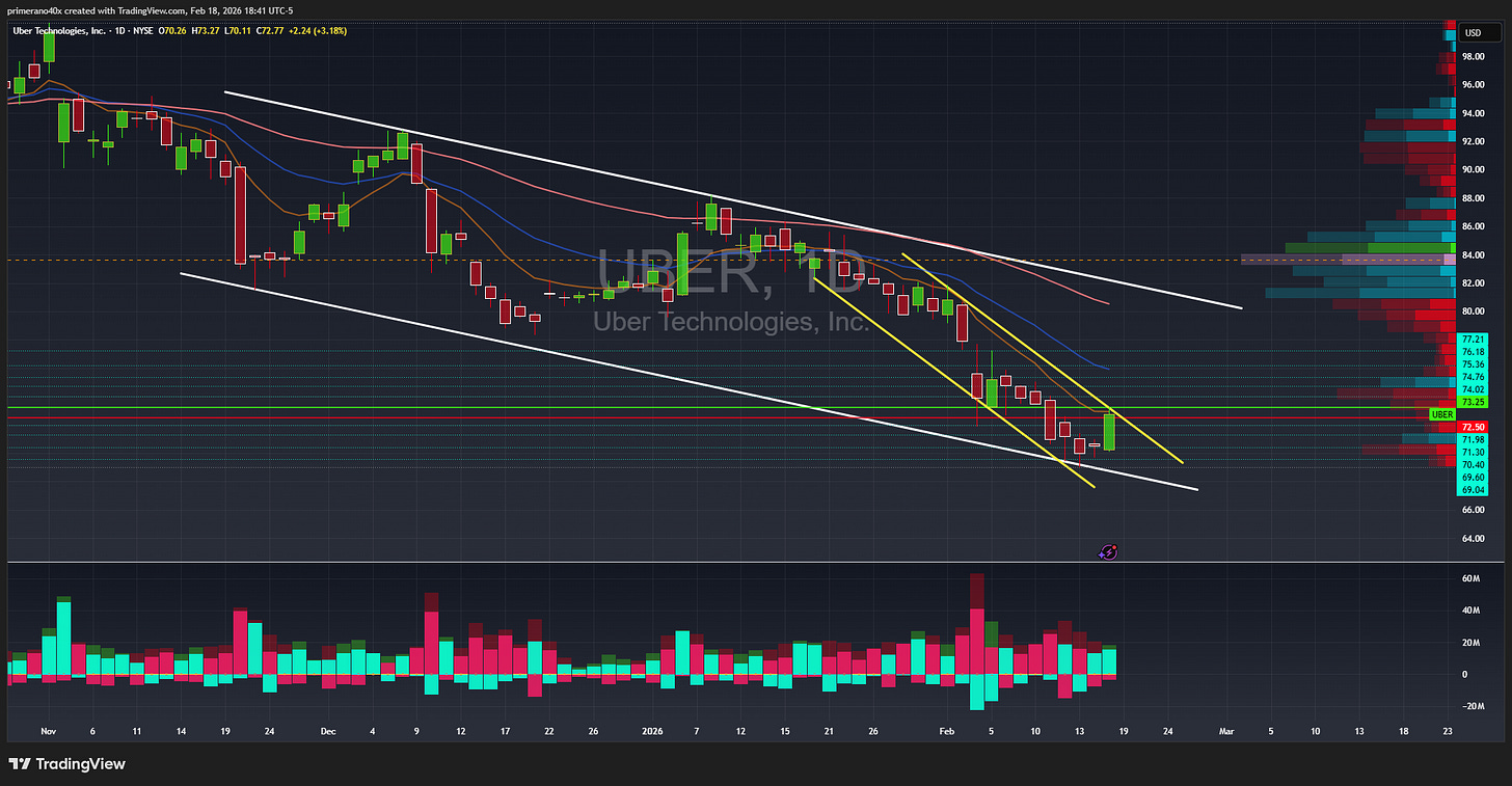 UBER 0.00%↑ daily bull flag (in a bull flag) setup. The smaller bull flag in yellow will be our guidance for entry. A break and hold over the trendline is our call trigger, and if we reject the trendline and fade we can trade puts and look towards the $71 level. Here’s the setup.