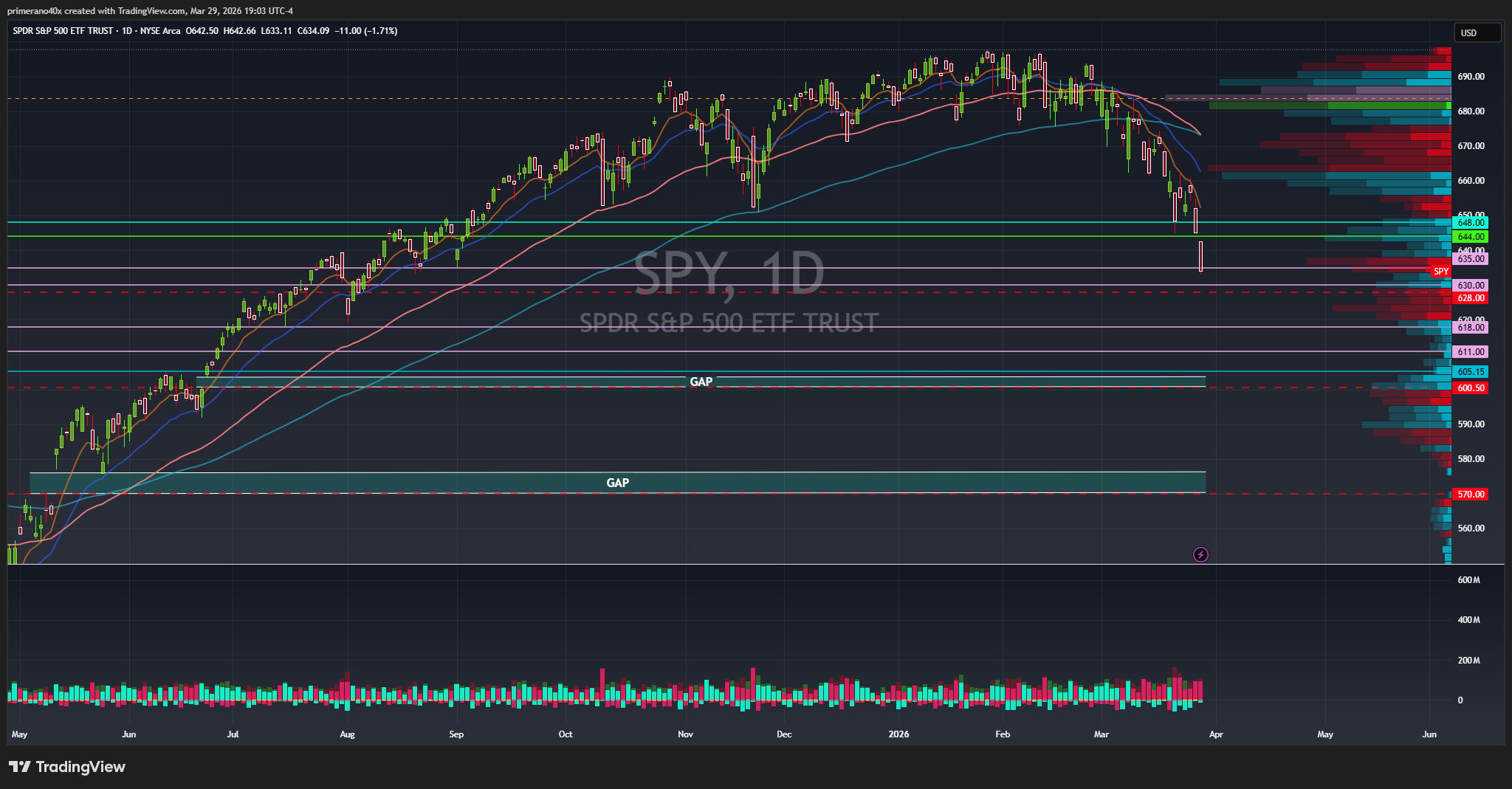 Futures opened down another -50 points to open the overnight session today, and that could mean more downside ahead this week. Since we regularly work with SPY in the Live Chat, let’s take a look at that chart. We are firmly entrenched in a down trend at this point, and the gap down on futures tonight puts this roughly at $628. If there is any chance for upside they bulls will need to quickly reclaim over $630 with volume, but I would still lean short on any extended time frame at this point until this reclaims over the $644 level. If we are unable to reclaim over $630 it opens up a move to retest prior lows at $618 and $611, with a gap to $600 as a likely temporary low. With this being a 4 day week (we are closed this Friday), I don’t know that we will see that move happen immediately. JPM will also roll their quarterly collar on Tuesday which could influence immediate direction.