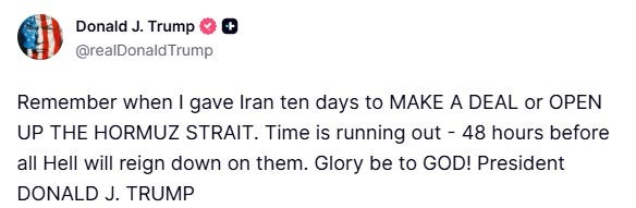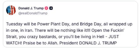 I’m not going to even begin to pretend to know what stage of toddler tantrum dementia batshittery this post is, but that is what we got this morning for Easter. It is clear that we don’t have control in Iran like Trump tells everyone that we do. We had planes shot down this weekend. More planes and helicopters shot down rescuing the pilots that were shot down. And now he is suddenly back to his magical countdown clock to make a deal while calling the Iranians ‘crazy bastards’ out of the other side of his mouth.