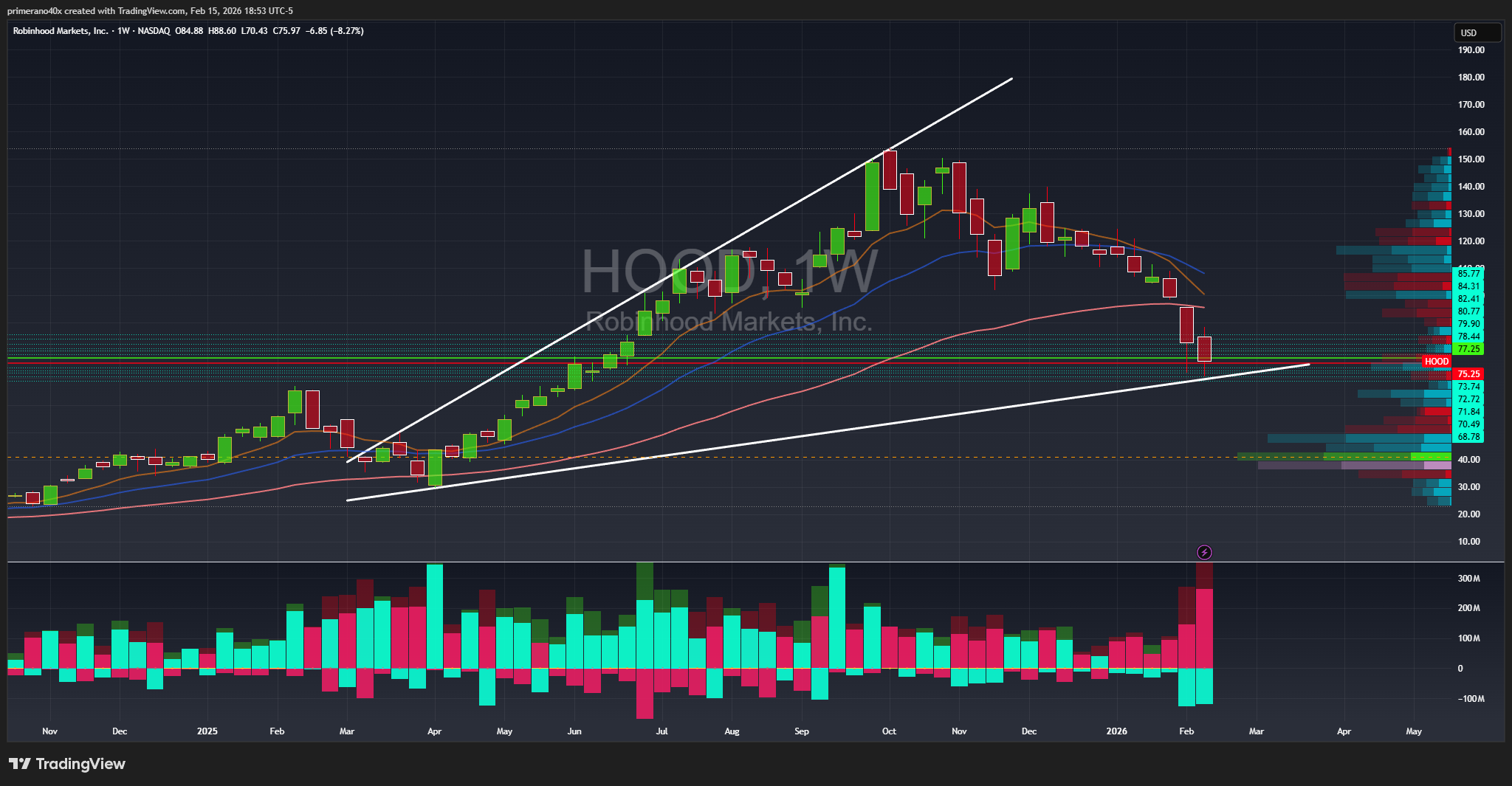 HOOD 0.00%↑ weekly broadening megaphone pattern and what we are looking for is a bounce off of the weekly trendline here for a chance to trade calls. If we can’t hold over our closing level on Friday we can trade puts and look for a retest of the trendline for a breakdown enabling continuation of a put trade, or resistance. Here’s the plan.